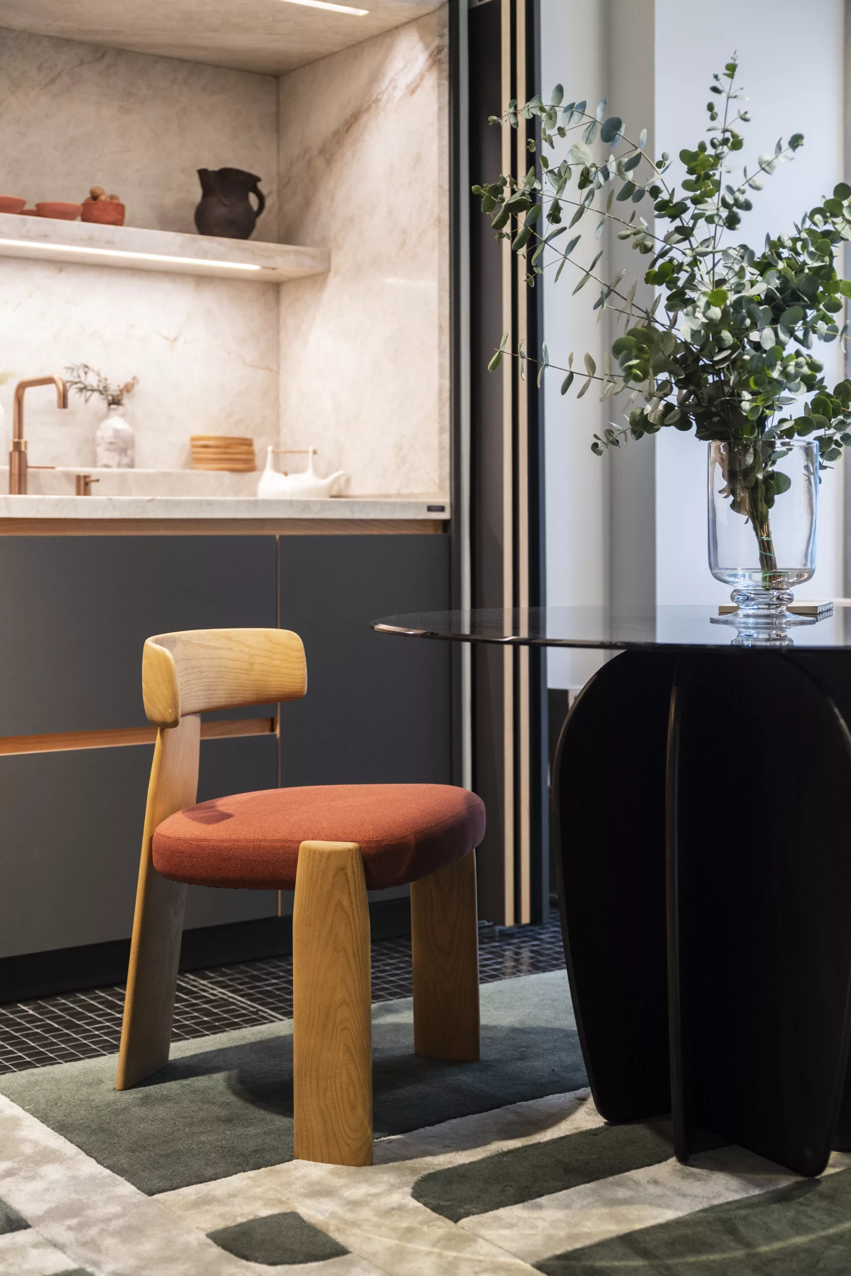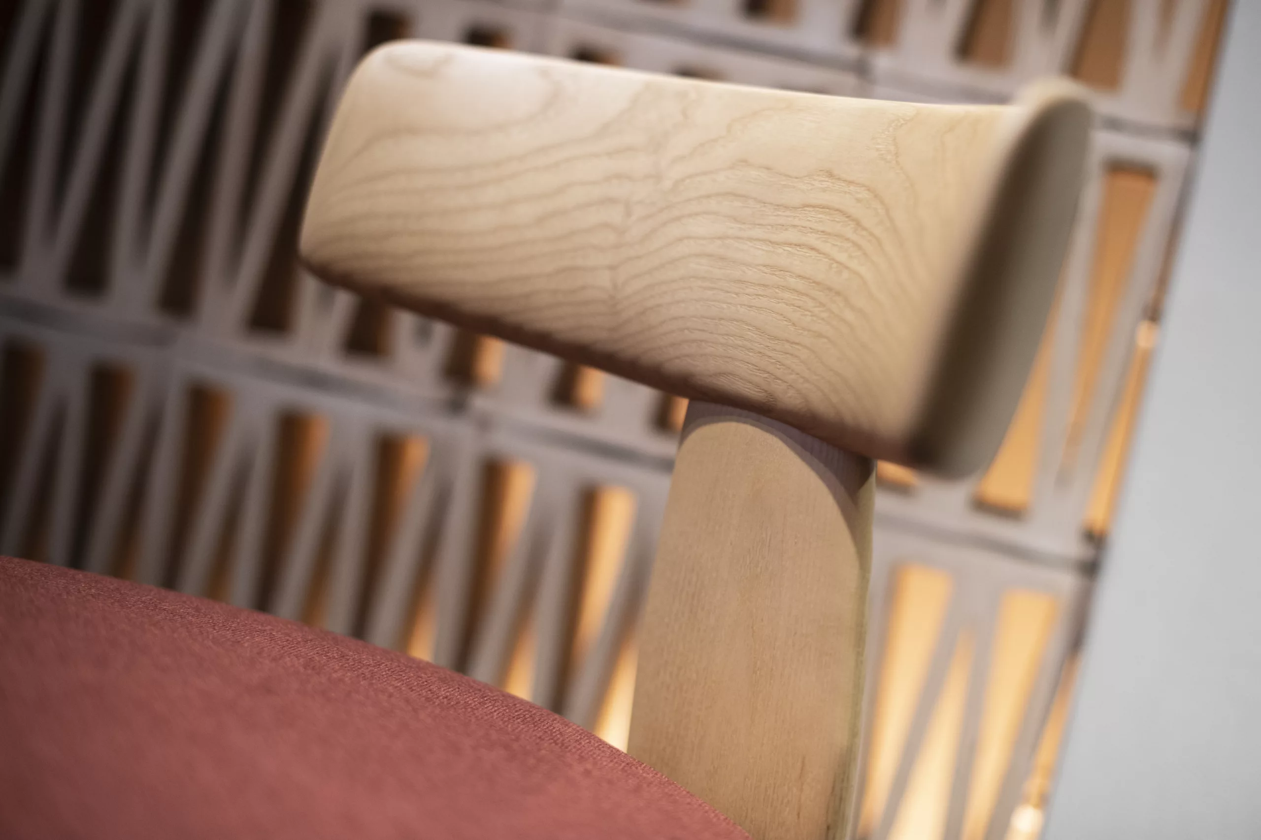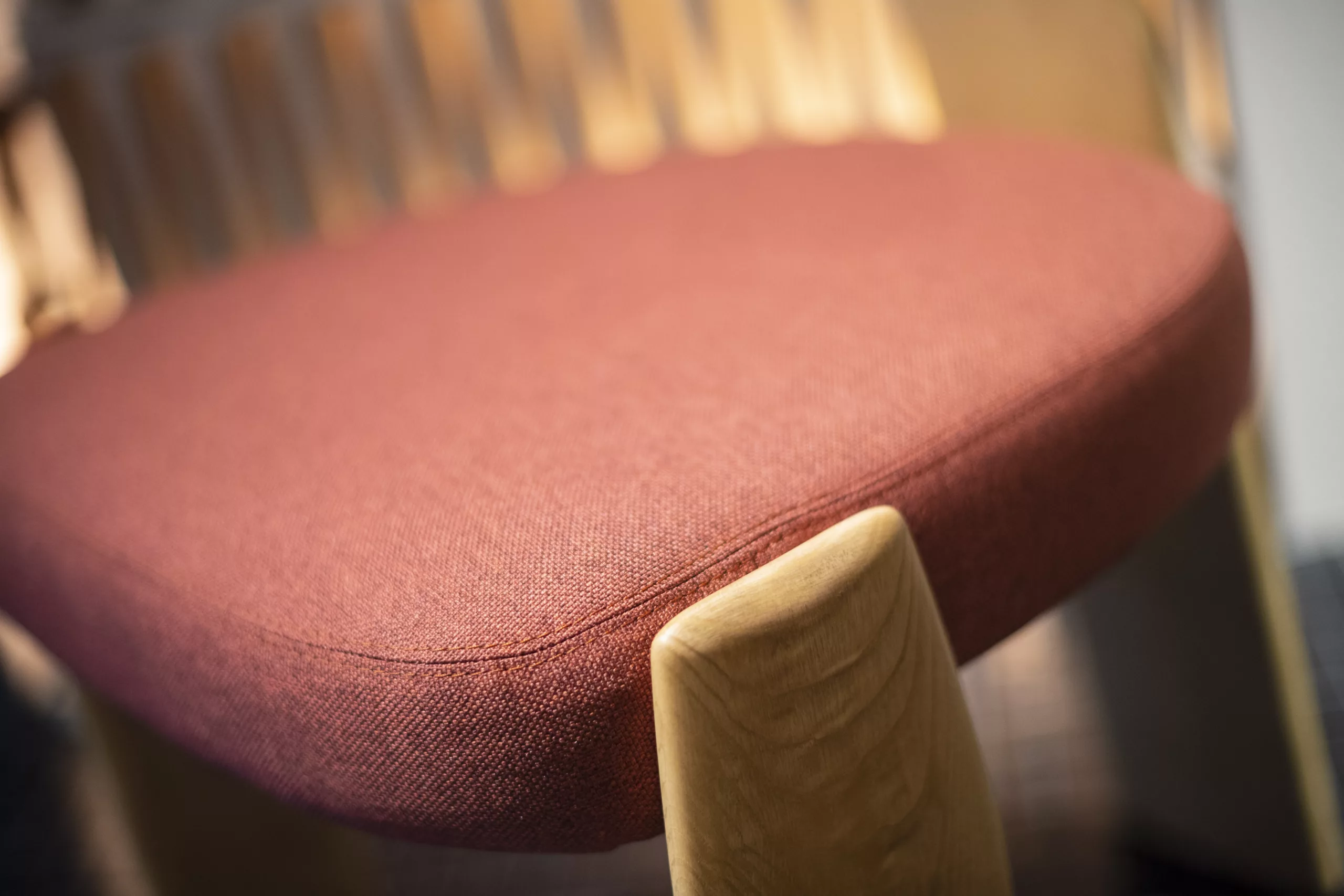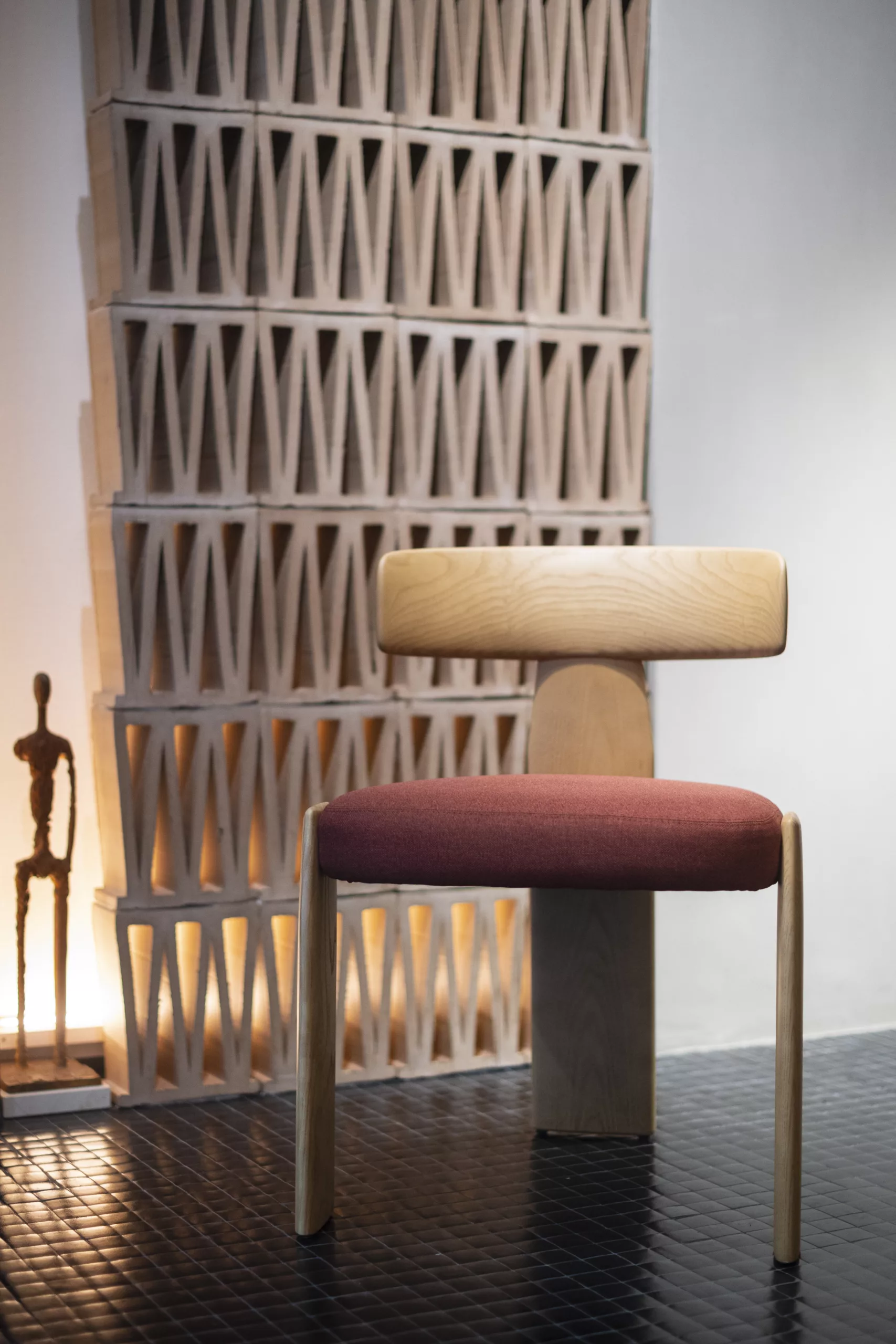 La silla ORU de Andreu World apuesta por un diseño escultórico, robusto y lleno de personalidad. Con una estructura en madera maciza de formas redondeadas y un asiento tapizado en tono burdeos, ORU destaca tanto por su presencia visual como por su comodidad. Su respaldo cilíndrico, ligeramente inclinado, aporta un apoyo ergonómico sin romper la armonía estética.